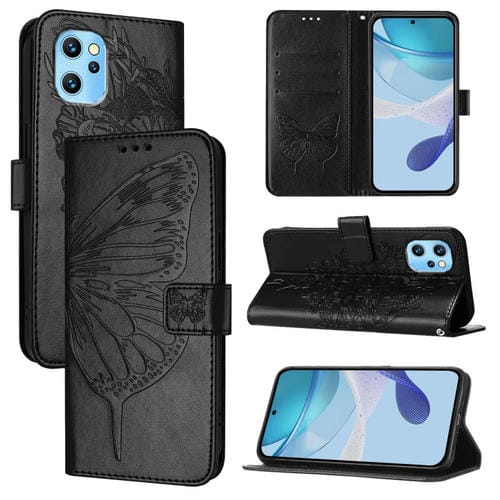 Funda de Cuero para Umidigi Power 7 Max con Diseño de Mariposa En Relieve (Negra)