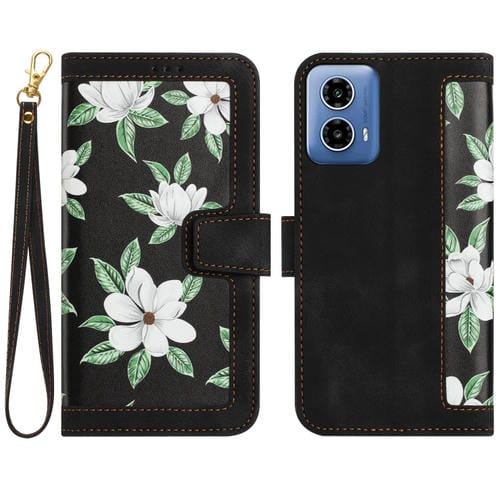 Funda de Cuero con Estampado Floral y Cordón para Motorola Moto G 5G (2024) (Negro)