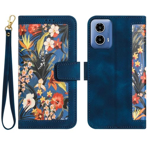 Funda de Cuero con Estampado Floral para Motorola Moto G24 con Cordón (Azul Oscuro)