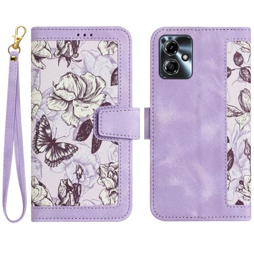 Funda de Cuero para Motorola Moto G54 con Estampado Floral y Cordón (Morado Claro)
