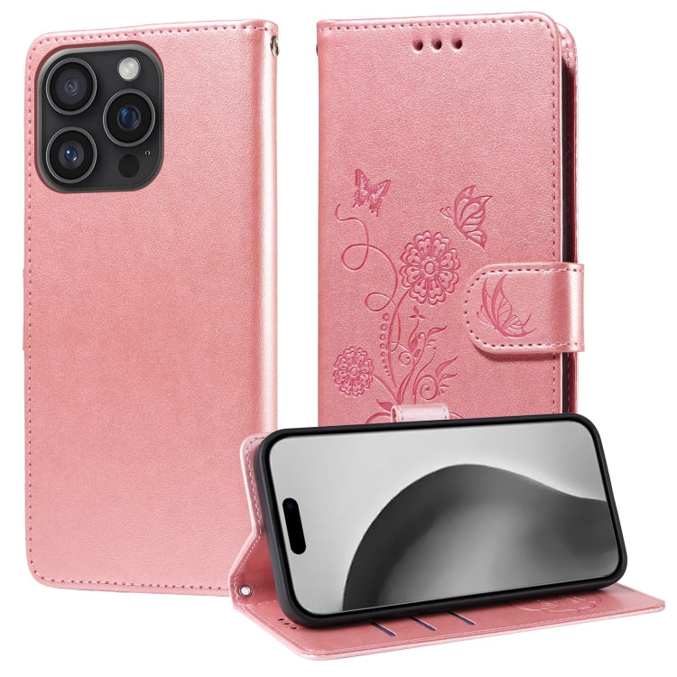 Funda de Cuero iPhone 16 Pro Max Diseño Mariposas y Flores En Relieve (Oro Rosa)