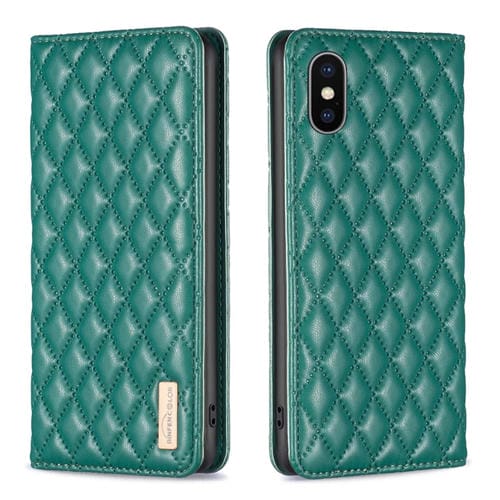 Funda de teléfono iPhone Xs X con tapa de cuero magnético Diamond Lattice (Verde)