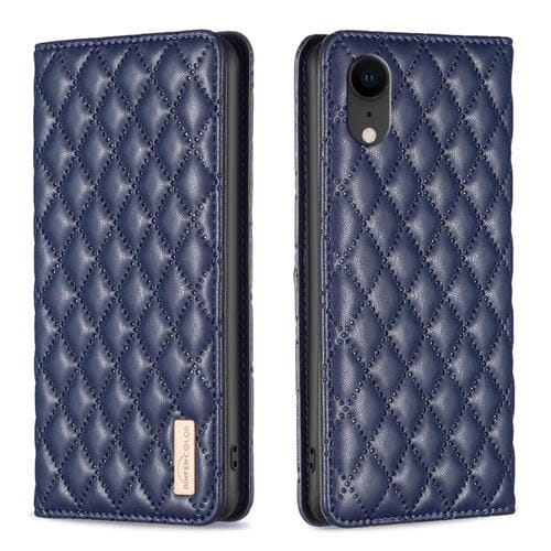 Funda de teléfono para iPhone Xr Diamond Lattice con tapa de cuero magnético (Azul)