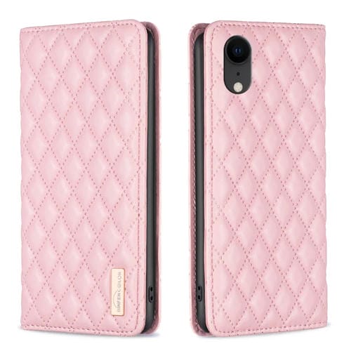 Funda de teléfono para iPhone Xr Diamond Lattice con tapa de cuero magnético (Rosa)