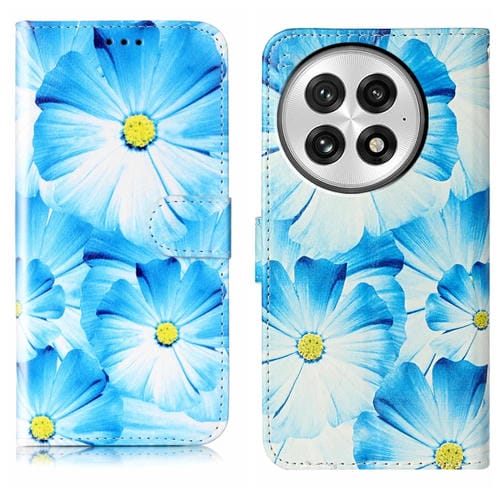 Funda de Cuero para OnePlus 13 con Patrón de Mármol y Dibujo de Flor Azul