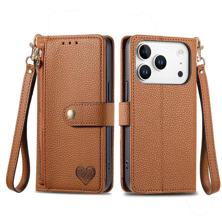 Funda de cuero con cordón y cremallera Love para iPhone 17 Pro (marrón)