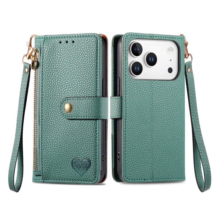 Funda de cuero con cordón y cremallera Love para iPhone 17 Pro (verde)