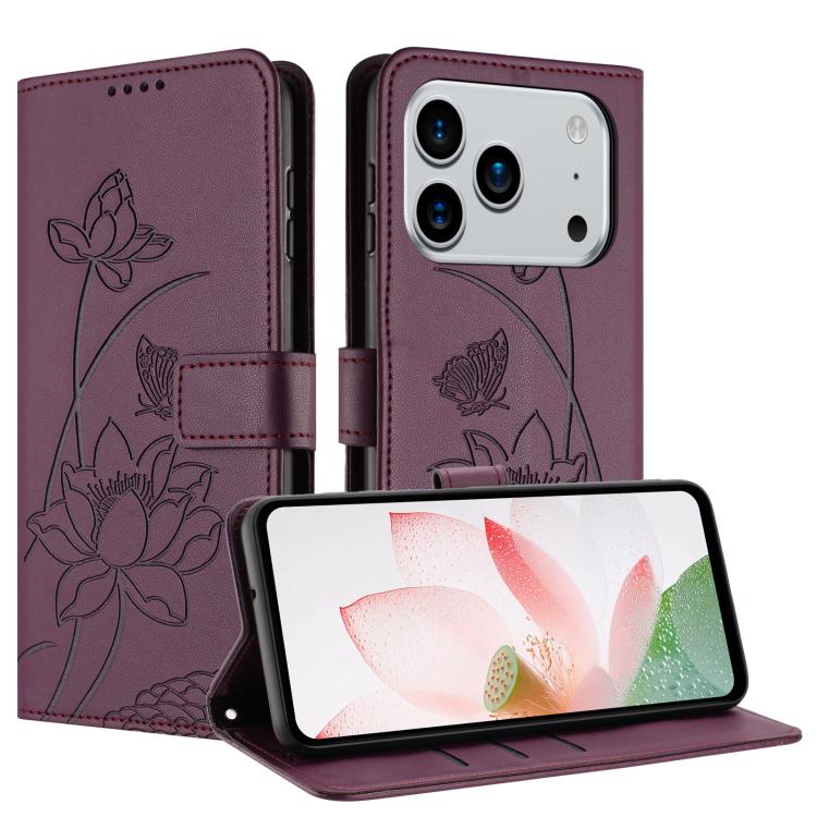 Funda de piel con relieve de loto para iPhone 17 Pro Max con cordón (rojo vino)