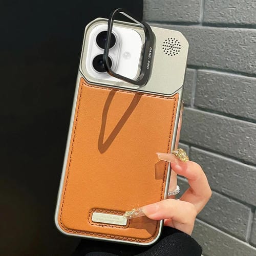 Funda de Cuero con Tapa de Metal y Función Atril para iPhone 16 (Marrón)