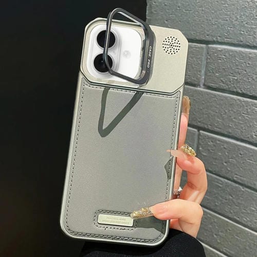 Funda de Cuero para iPhone 16 con Soporte de Metal y Función Magsafe (Gris)