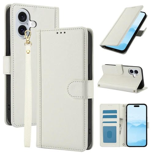Funda para iPhone 16 Plus de Cuero con Ranuras para Tarjetas y Cordón Doble (Blanco)