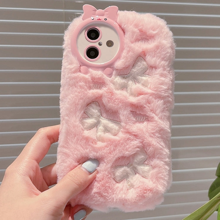 Funda para iPhone 16 Bordado de Felpa Cobertura Total (Rosa + Lazo Blanco)