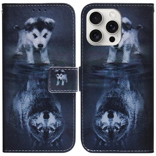 Funda de Cuero para iPhone 16 Pro Max con Tapa y Dibujo Coloreado (Lobo y Perro)