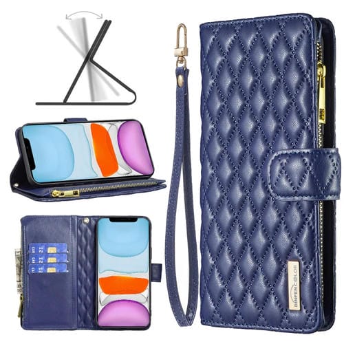 Funda para iPhone 11 Diamond Lattice Zipper Wallet de Cuero con Tapa (Azul)