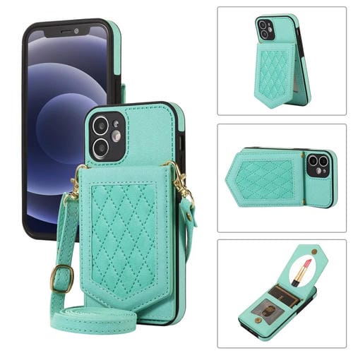 Funda para iPhone 11 Rhombic Texture Rfid con Cordón y Espejo (Verde Menta)