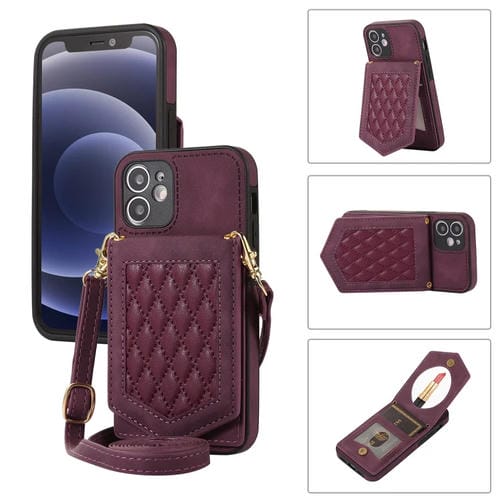 Funda para iPhone 11 Rhombic Texture Rfid con Cordón y Espejo (Rojo Vino)