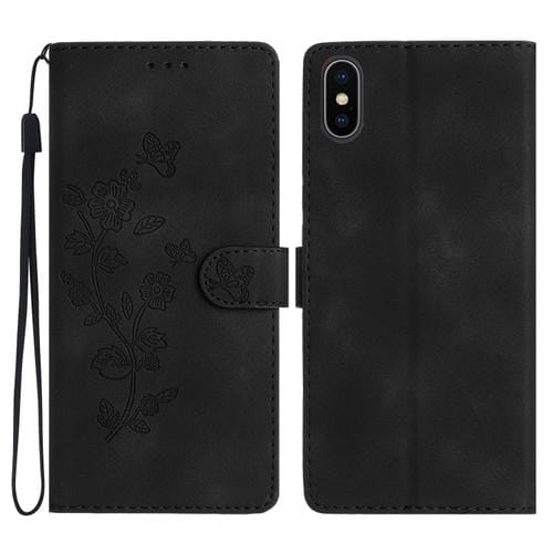 Funda de teléfono iPhone X / Xs cuero estampado flores en relieve (Negro)