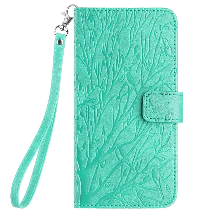 Funda de Teléfono iPhone 14 Cuero Patrón En Relieve Pájaros de Árbol (Verde)