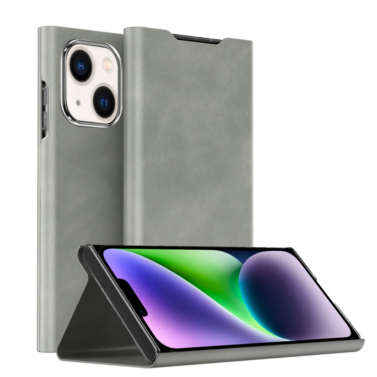 Funda Magnética de Cuero para iPhone 14 con Textura de Napa y Soporte (Gris)