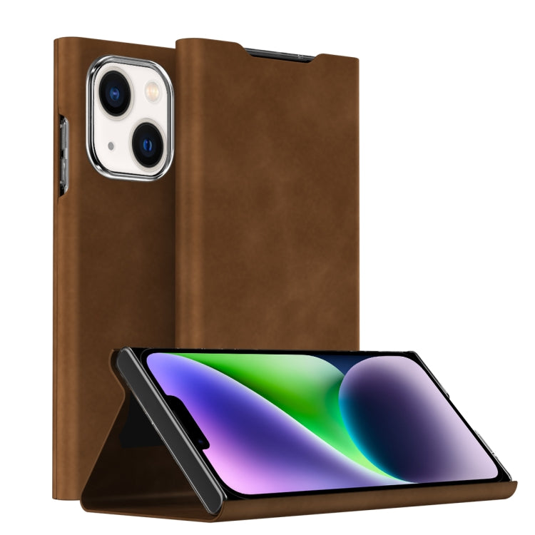 Funda Magnética de Cuero para iPhone 14 con Textura de Napa y Soporte (Marrón)