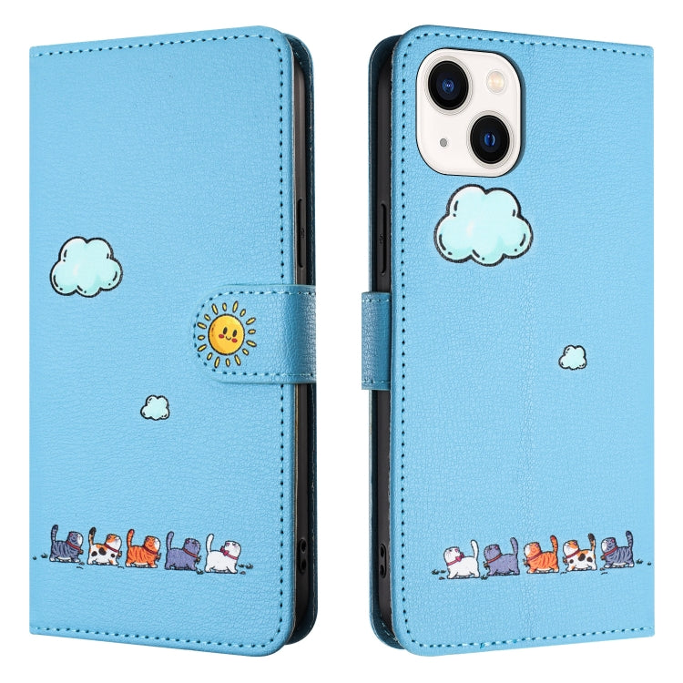 Funda de Cuero para Teléfono iPhone 14/13 con Gatos de Dibujos Animados (Azul)
