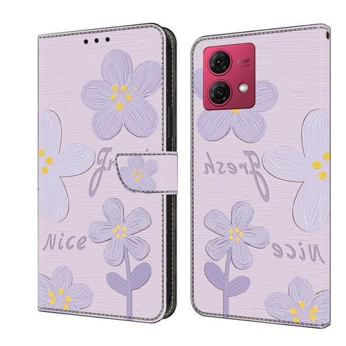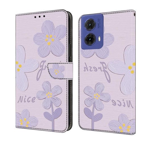 Funda de Cuero Pintada a Mano para Motorola Moto G85 con Flores Moradas (Óleo)