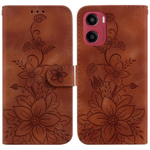 Funda de Cuero con Relieve de Lirio para Motorola Moto G05/E15 (Marrón)