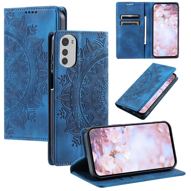 Funda de Cuero Magnética en Relieve para Motorola Moto E32 Totem (Azul)