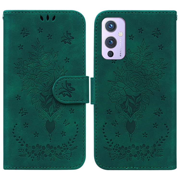 Funda para OnePlus 9 Pro Butterfly Rose Foothip en Relieve de Cuero (Verde)