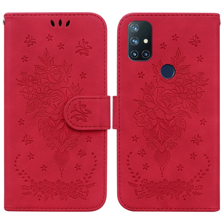 Funda para OnePlus Nord CE 5G Butterfly Rose Foothip en Relieve de Cuero (Rojo)
