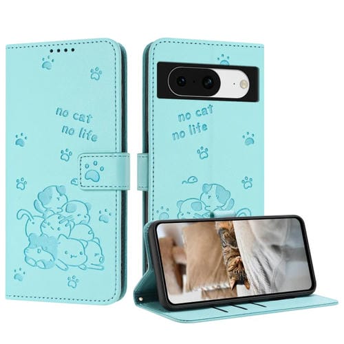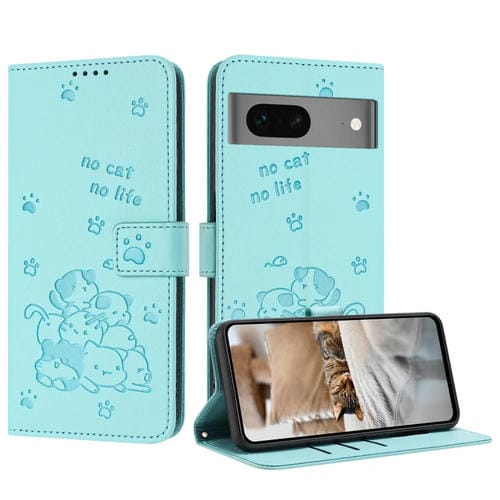 Funda de Cuero Google Pixel 7 con Diseño de Gatito en Relieve y Cordón (Azul)