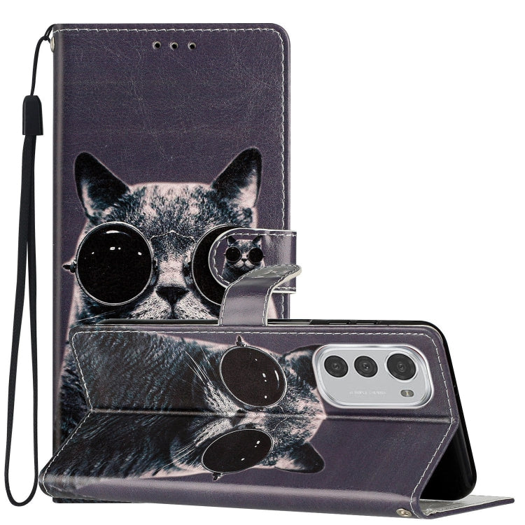Estuche de Cuero para Motorola Moto E32 con Dibujo Coloreado Gafas de Sol Cat
