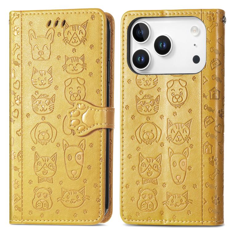 Funda de piel con estampado de gato y perro para iPhone 17 Pro Max (amarilla)