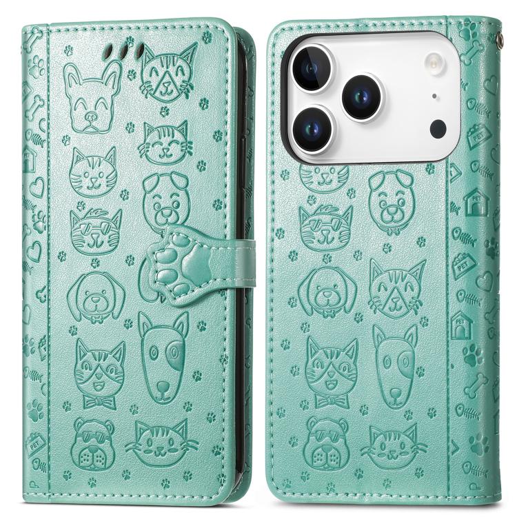 Funda de piel con estampado de gato y perro para iPhone 17 Pro Max (verde)