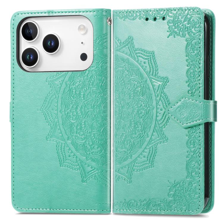Funda de cuero con relieve de flor de mandala para iPhone 17 Pro Max (verde)
