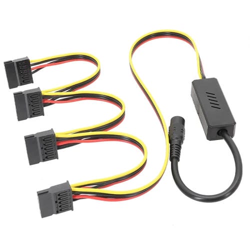 - Cable tipo 1007 18AWG; conversión de voltaje de 12V a 5V mediante regulador reductor; longitudes variables según modelo (de uno a cuatro Conectores SATA); peso entre 40 g y 65 g según versión