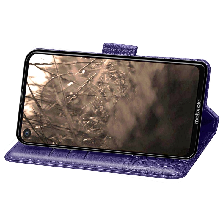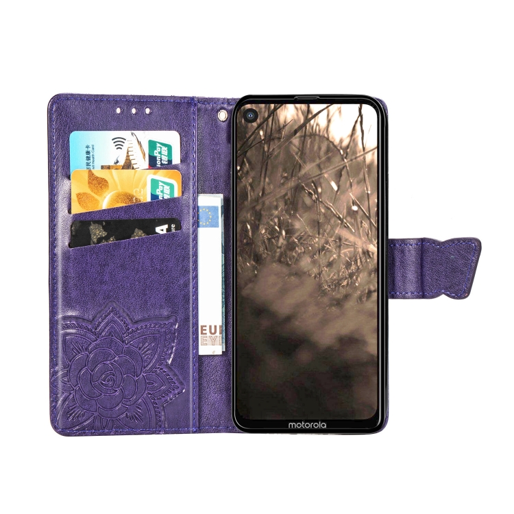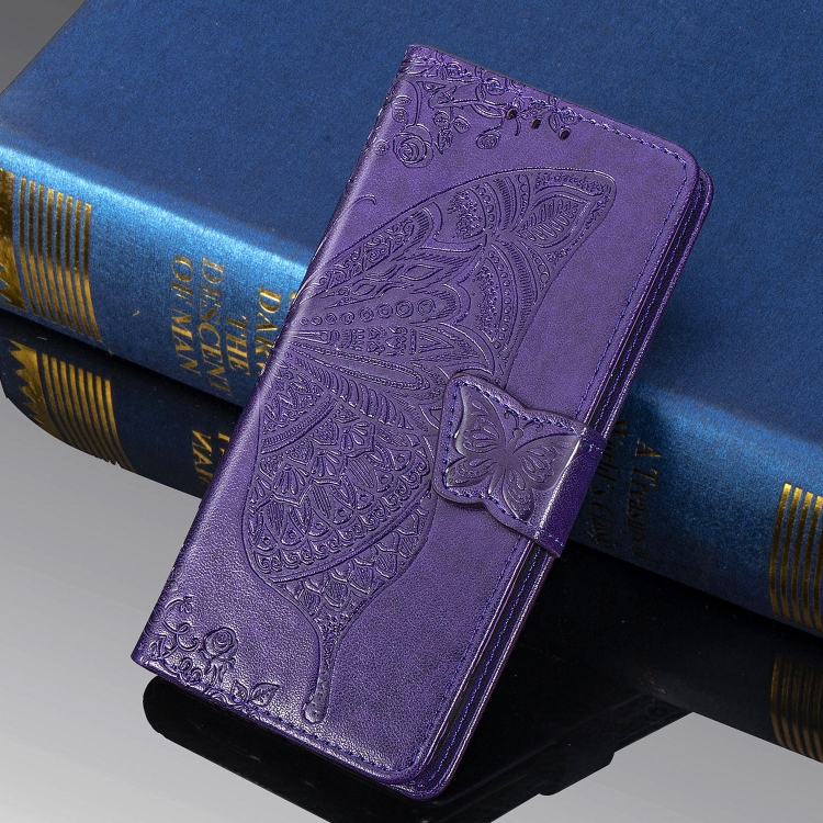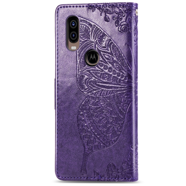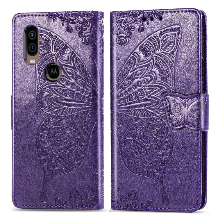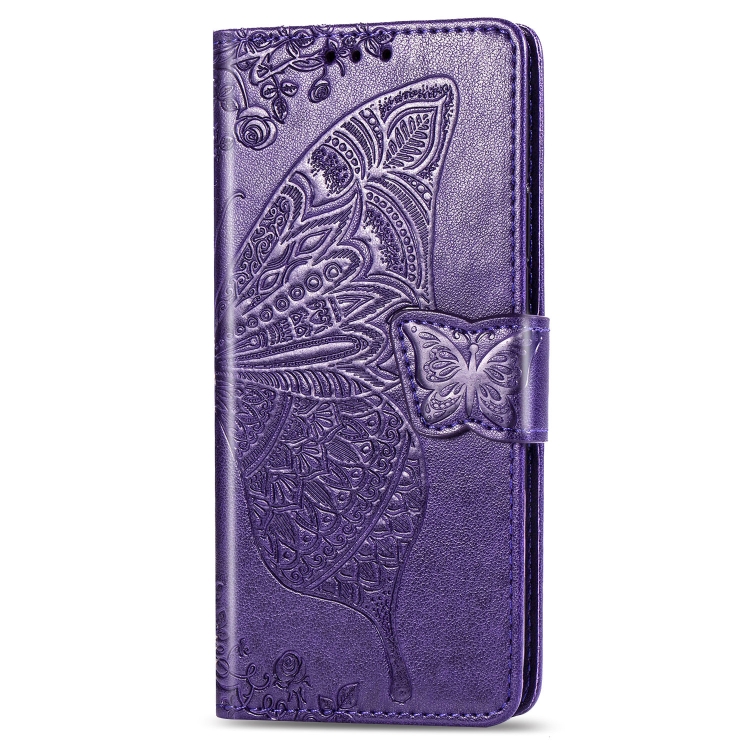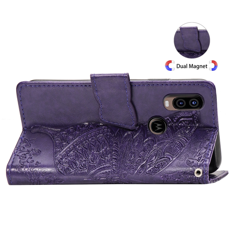 Funda de Cuero Butterfly Love Flowers para Motorola P40 con Tapa Horizontal, Soporte, Ranuras, Billetera y Cordón (Morado Oscuro)