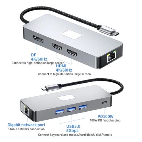 La estación de acoplamiento 8 en 1 Byl-2401 es un hub multifuncional diseñado para ampliar la conectividad de dispositivos con Puerto Tipo C. Compatible con equipos que soportan USB 3.0 y protocolos PD, esta estación permite la Conexión simultánea de diversos periféricos como discos duros, Teclados, y ratones, facilitando la transferencia de datos a alta velocidad y la Carga rápida de dispositivos. Su función Principal es ofrecer una solución integral para la expansión de Puertos, incluyendo salidas de video HDMI y DisplayPort con resolución ultra clara 4K a 60Hz, además de un Puerto Gigabit Ethernet para Conexión de red estable y fluida. La estructura está fabricada en aleación de aluminio que mejora la disipación térmica, garantizando un rendimiento óptimo durante su uso.