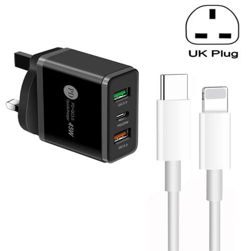 Cargador Multipuerto USB PD3.0 + 2x QC3.0 45W con Cable Tipo C a 8 Pines (Negro)
