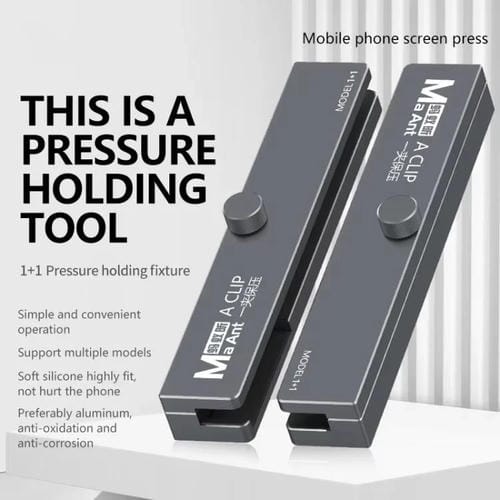 El accesorio de sujeción por presión fija MaAnt es un dispositivo diseñado para la manipulación y mantenimiento de Pantallas planas en Teléfonos Móviles. Este modelo 2 en 1 permite una sujeción precisa y estable, facilitando la extracción y mantenimiento de la Pantalla con un ajuste cómodo y seguro. Compatible con múltiples modelos de Teléfonos Móviles gracias a su altura ajustable entre 5 y 13 mm, este accesorio incorpora una ranura protectora para la Cámara con almohadillas antideslizantes que previenen daños durante su uso. Fabricado en aluminio antioxidante y anticorrosivo, garantiza durabilidad y resistencia en aplicaciones Técnicas de reparación y mantenimiento.