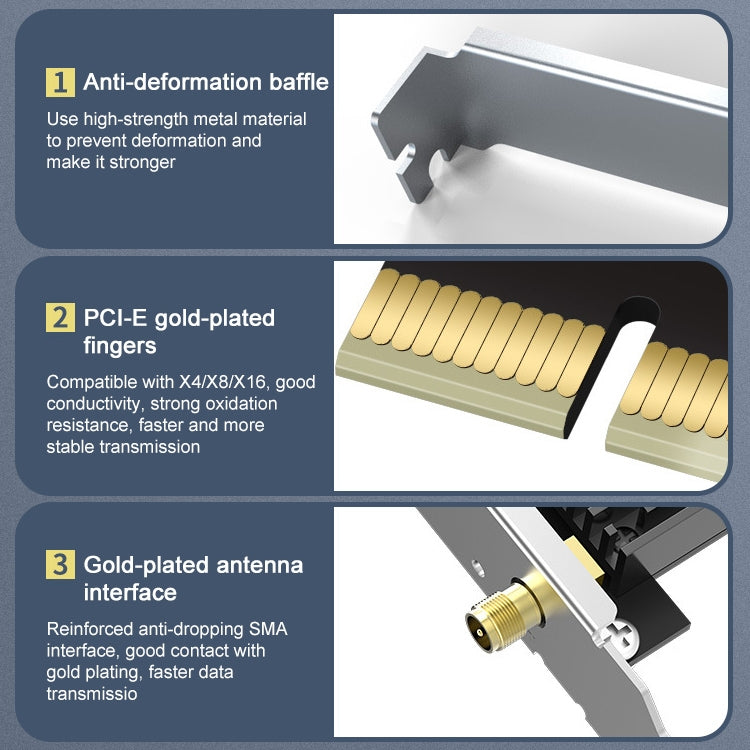 • 1x Tarjeta de Red PCI-E Comfast CF-AX181 Pro 3000Mbps Tri-Band Bluetooth 5.2 Wifi6E con Disipador de Calor
