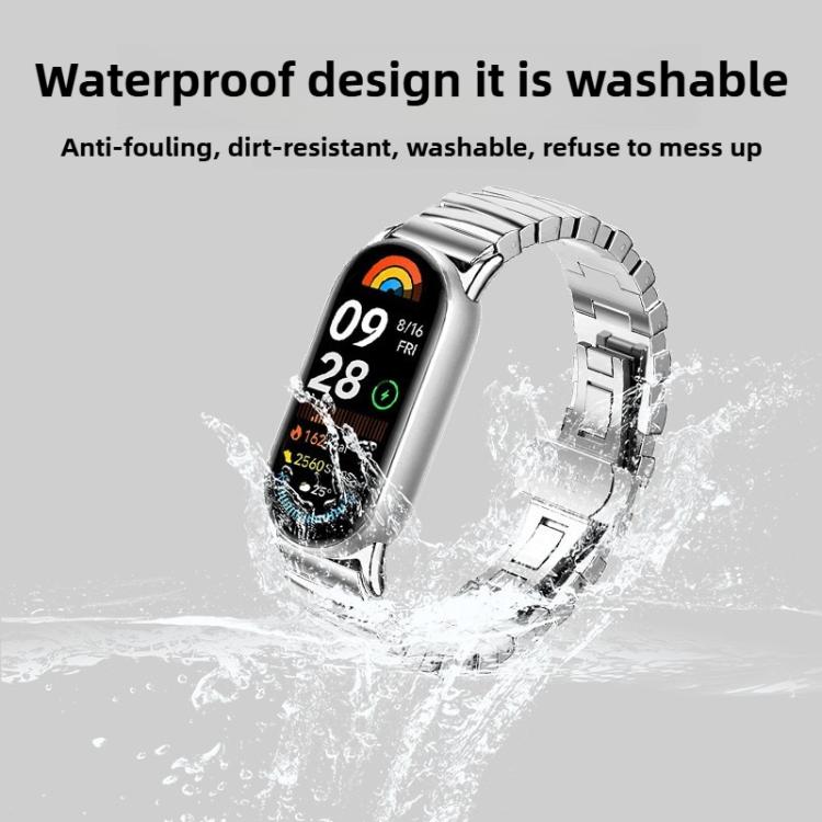 Correa de acero inoxidable con hebilla de mariposa irregular para Xiaomi Smart Band 9/8 (oro rosa)