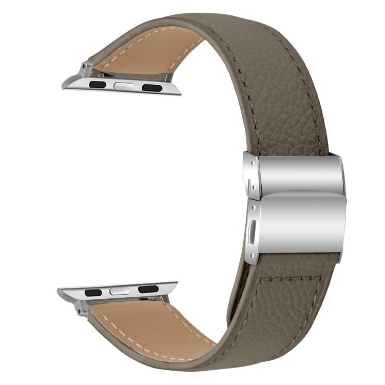 Correa de cuero con hebilla trasera de tortuga plateada y textura de lichi para Apple Watch de 46 mm, 49 mm, 45 mm y 44 mm (gris)