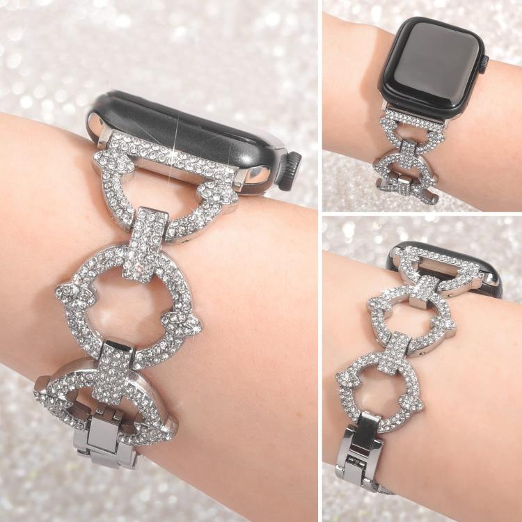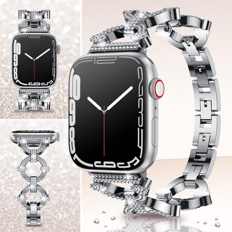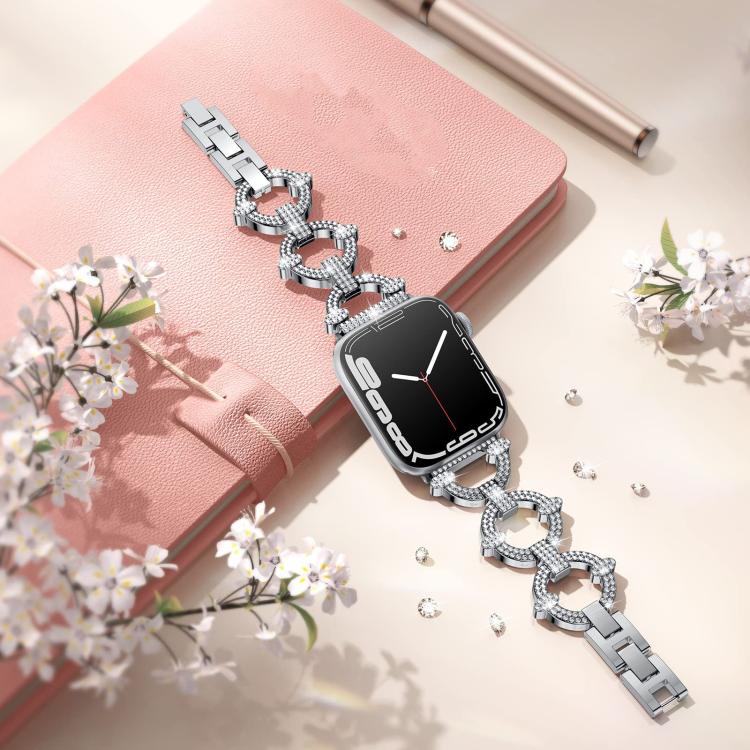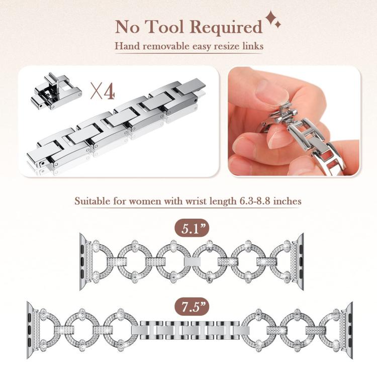 Correa de metal con diamantes en forma de O para Apple Watch de 42, 44, 45, 46 y 49 mm xDfind (plateada)