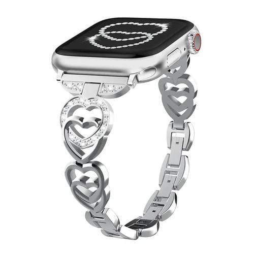 Correa de metal con doble corazón y diamantes xDfind para Apple Watch de 42, 44, 45, 46 y 49 mm (plateada)