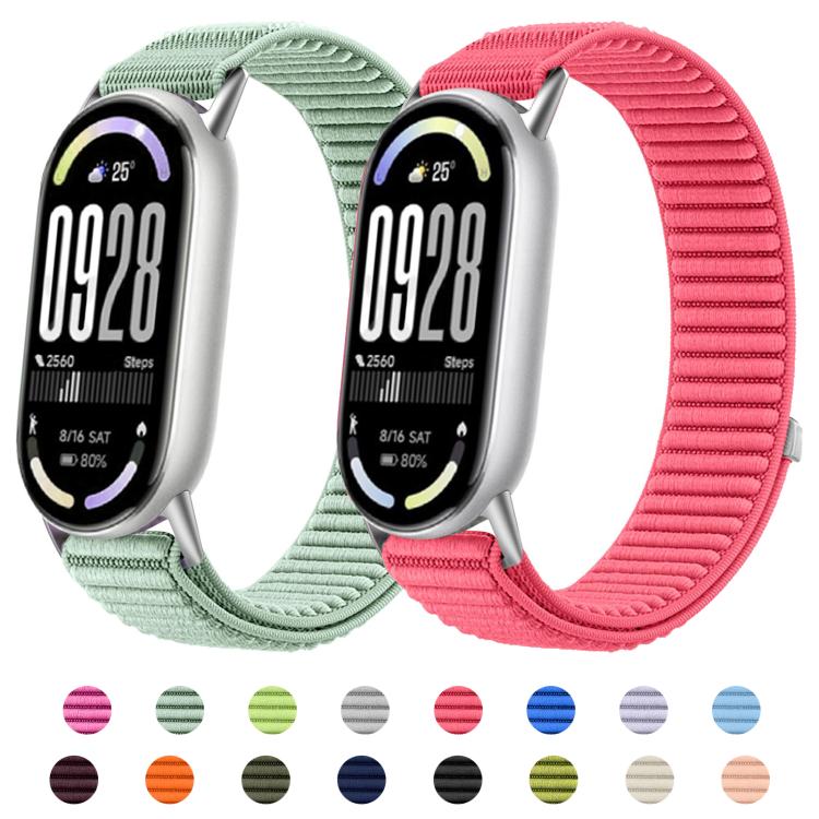 Correa de reloj de nailon tejido con cierre de velcro y interfaz metálica para Xiaomi Smart Band 10/9/8 (verde suave)