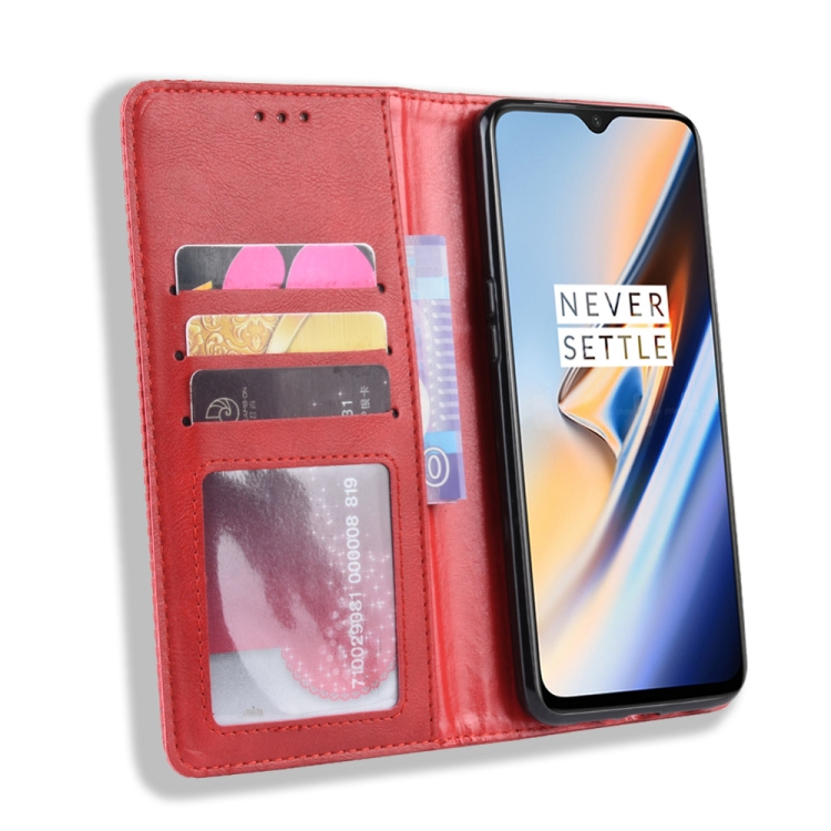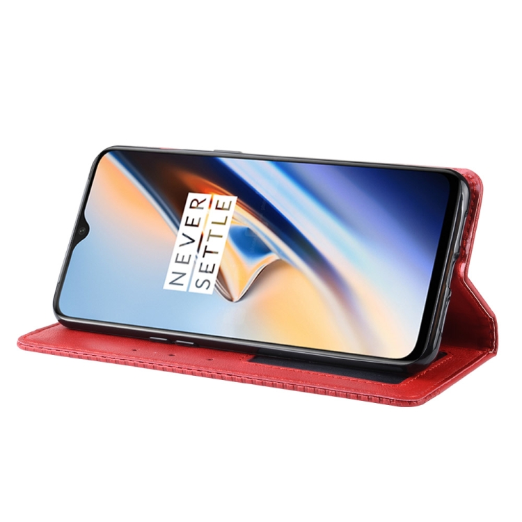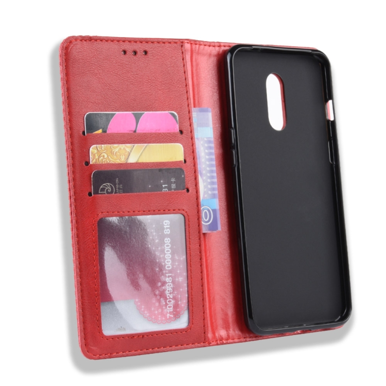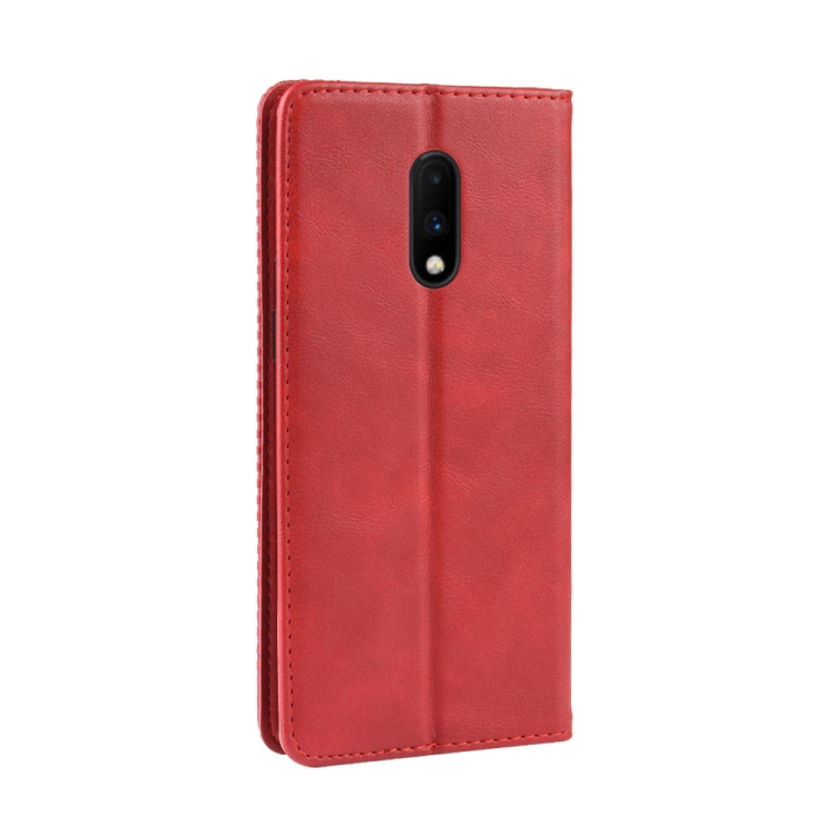Estuche de Cuero OnePlus 7 con Tapa Horizontal, Hebilla Magnética, Soporte, Ranuras y Marco de Fotos (Rojo)