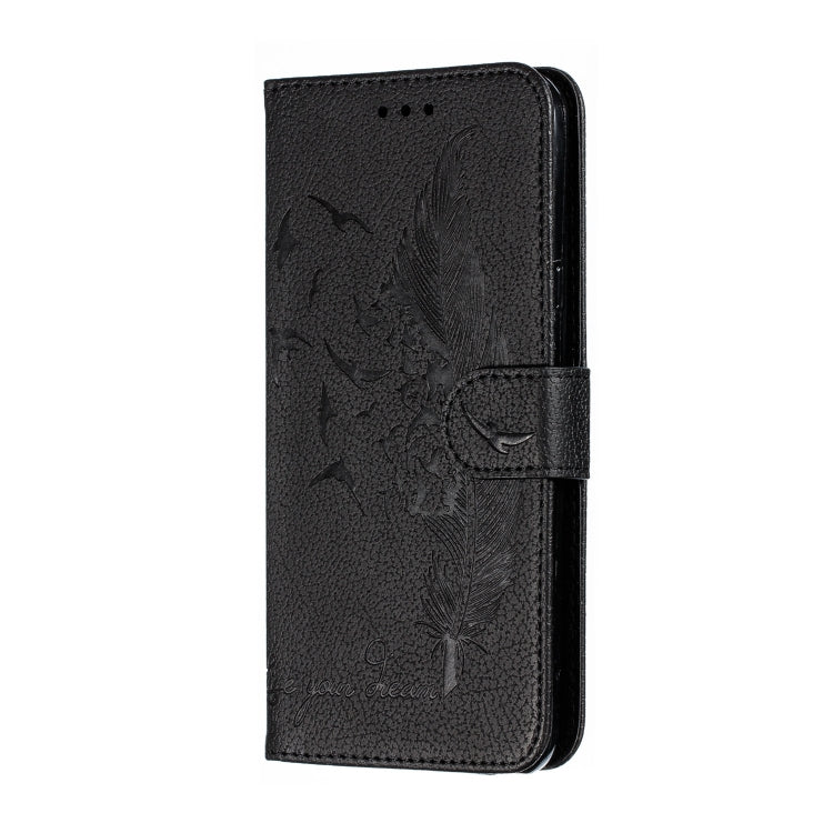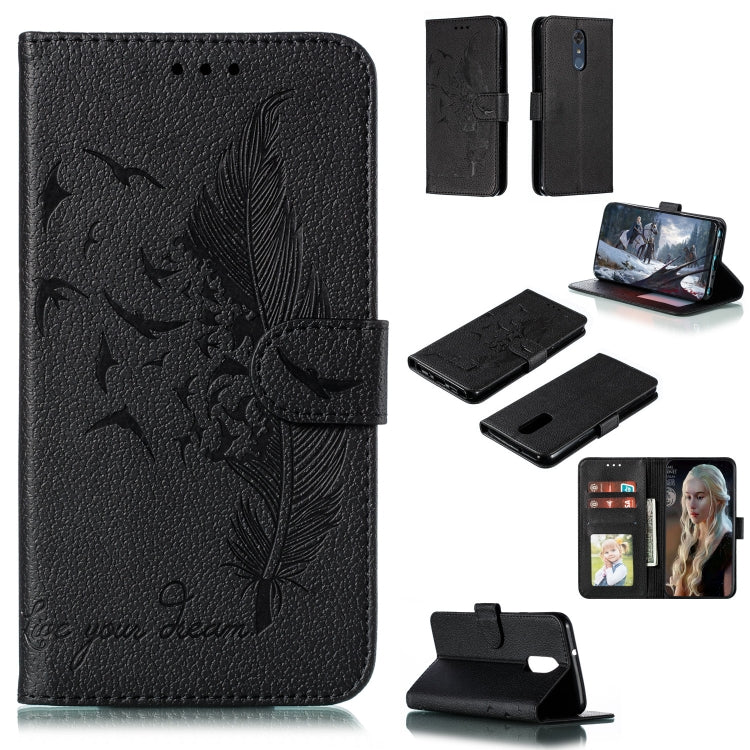Estuche de Cuero con Tapa Horizontal Textura Litchi Diseño Plumas Billetera Soporte Ranuras para LG Stylo 4 (Negro)