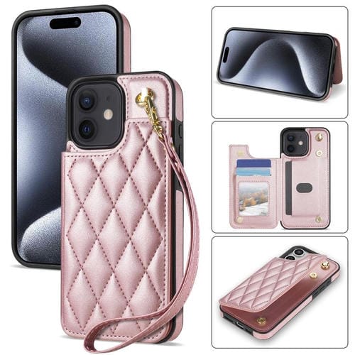 Estuche para Teléfono Rombal iPhone 12/12 Pro Ranuras Tarjetas Hebilla Doble Cordón (Oro Rosa)