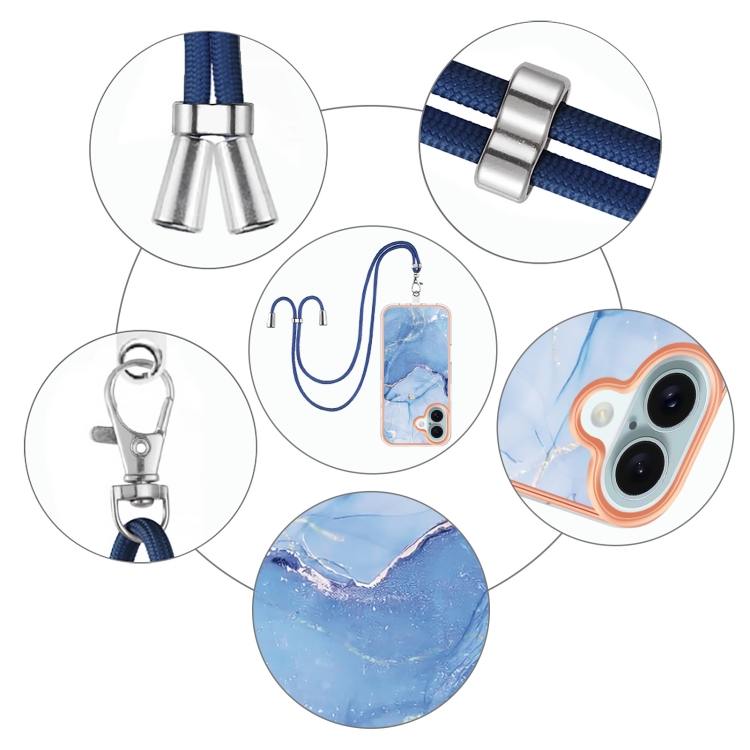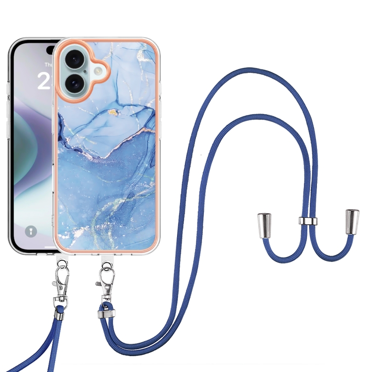 Estuche para Teléfono Imd Doble Cara con Revestimiento Mármol Galvanizado para iPhone 16 con Cordón (Azul)